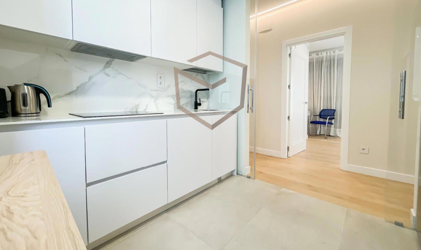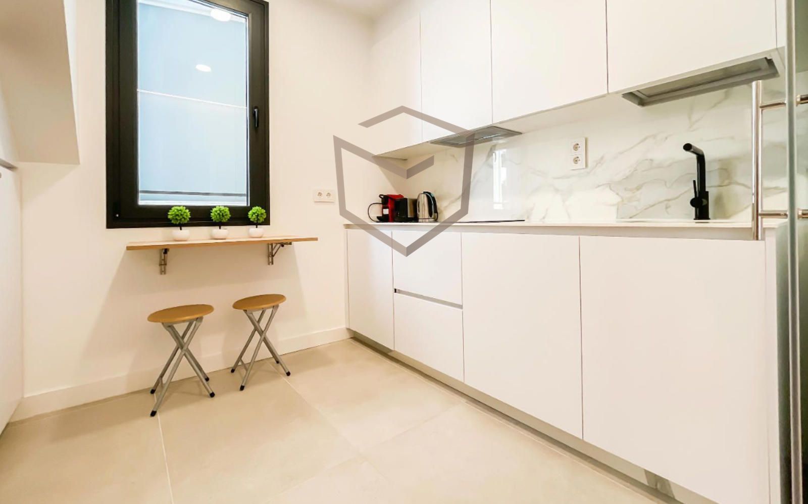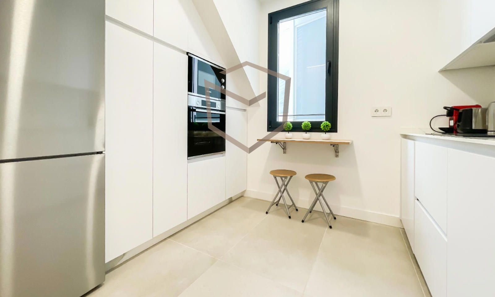 La vivienda se distribuye en una amplia zona social con salón y comedor, muy luminosos gracias a sus ventanales a la calle. La cocina, independiente, se encuentra completamente equipada con electrodomésticos y vajilla incluida.
